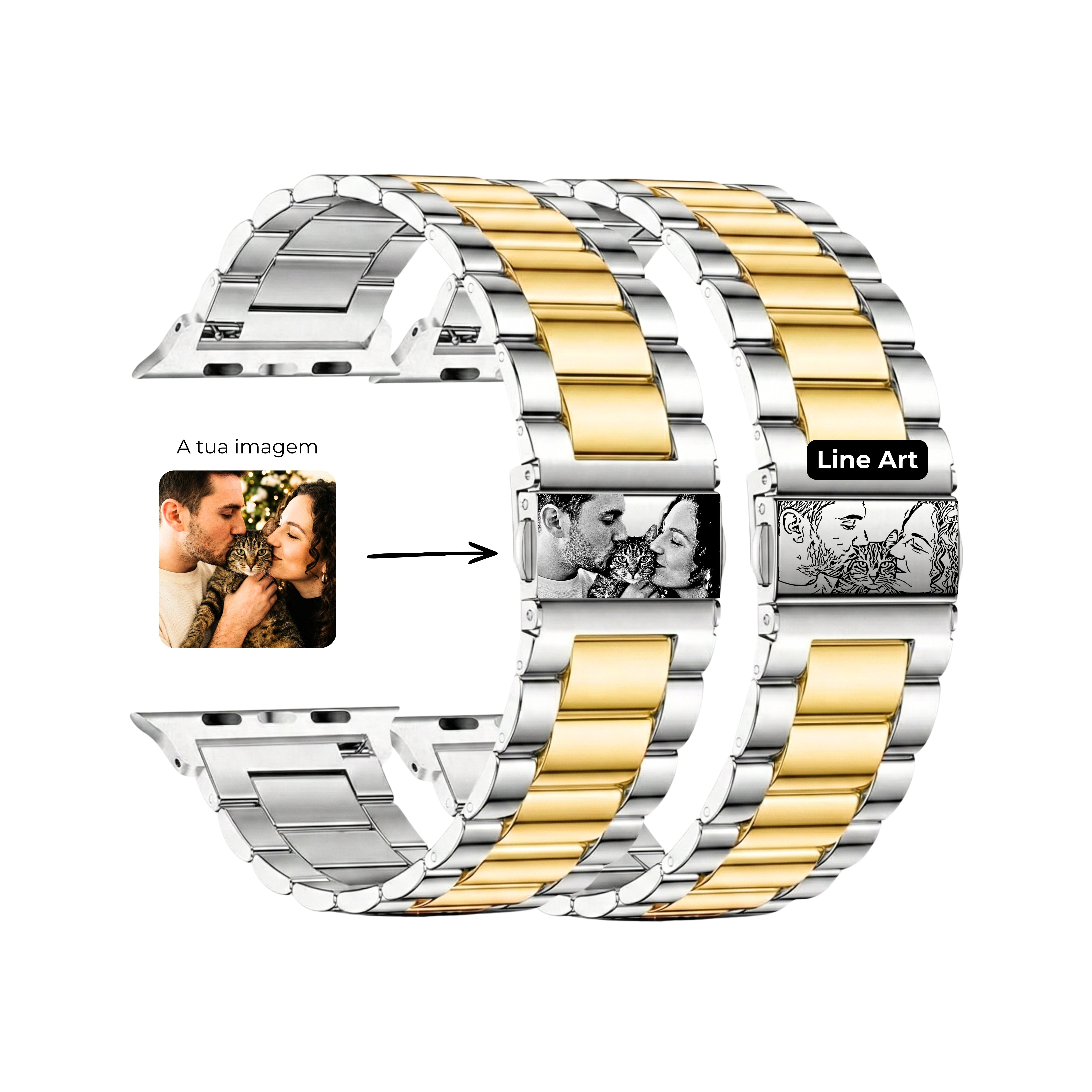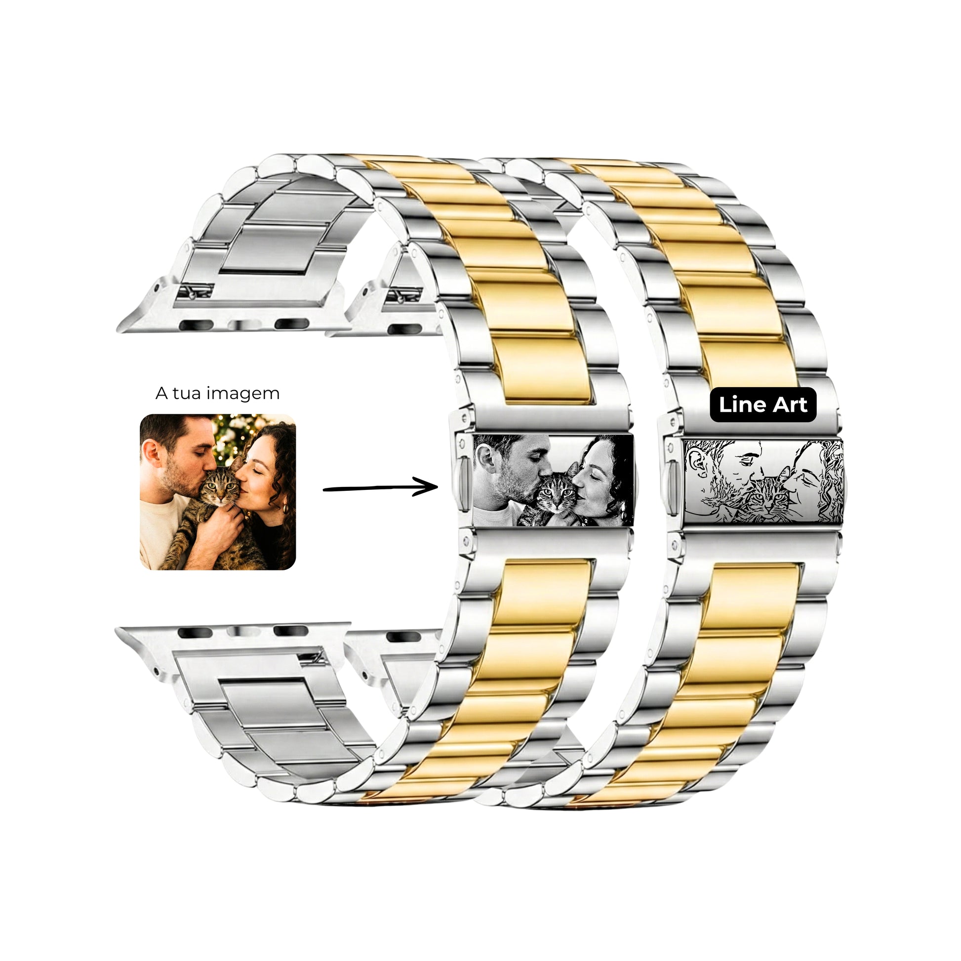 Bracelete em Aço Inoxidável, resistente e duradoura, com encaixe perfeito e possibilidade de ajuste. Fácil de instalar/retirar e cómoda.