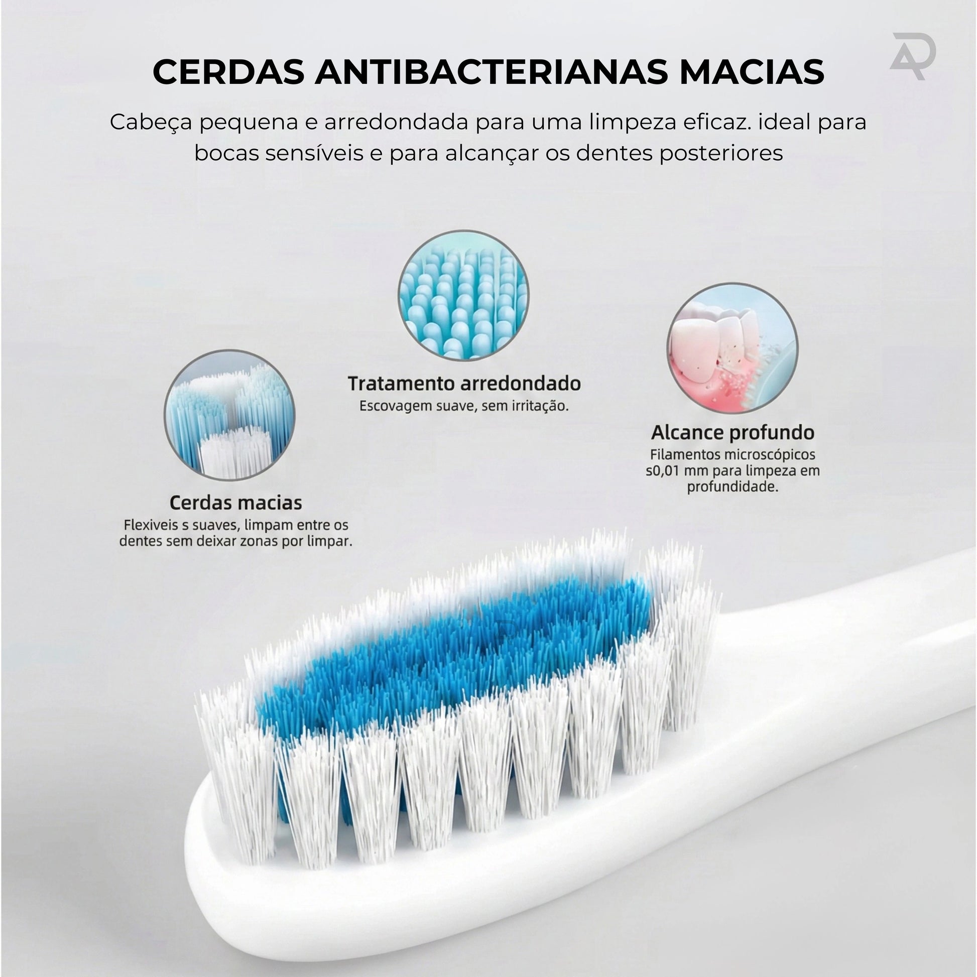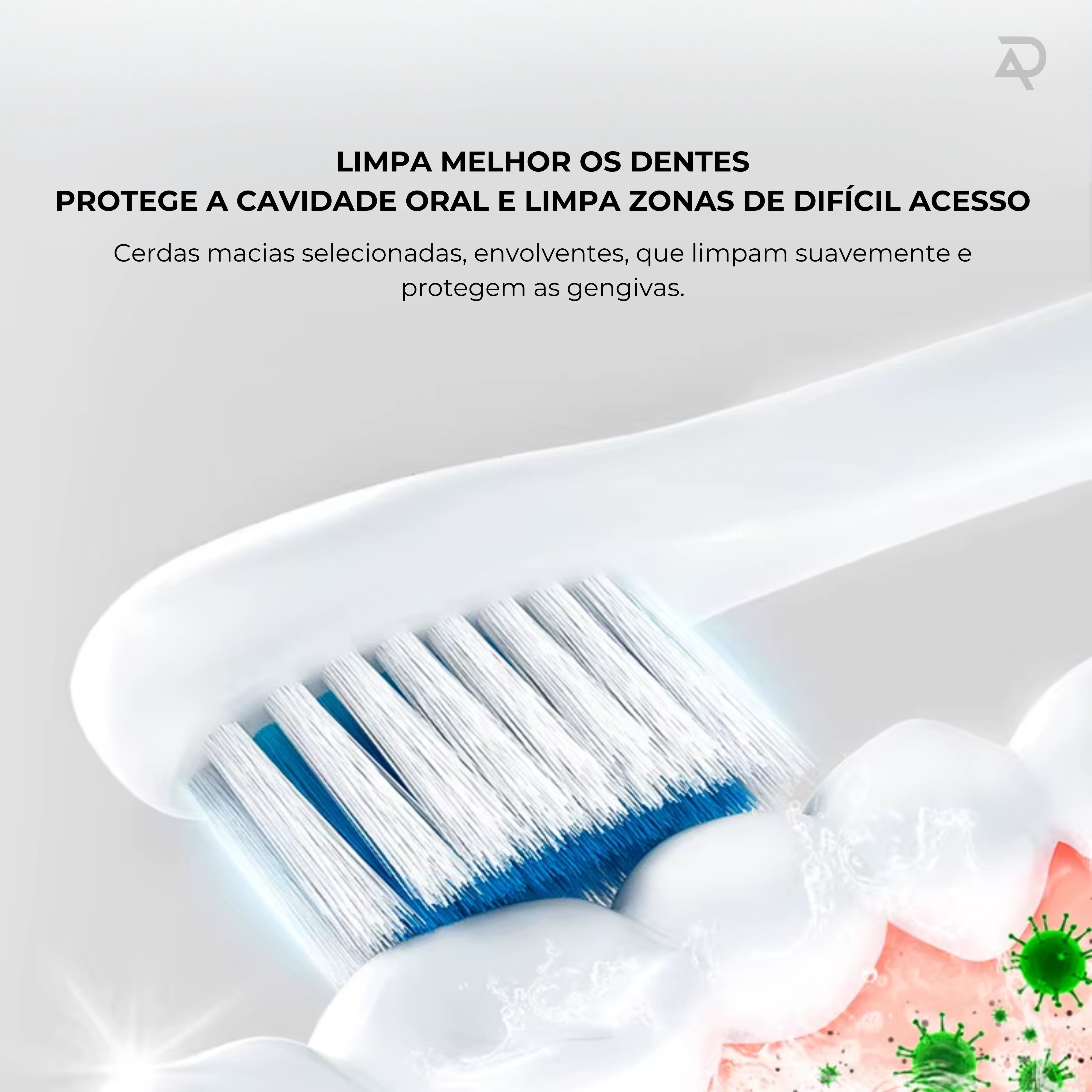 Cerdas macias DuPont e modos específicos para gengivas sensíveis garantem uma escovagem confortável, sem agressões.