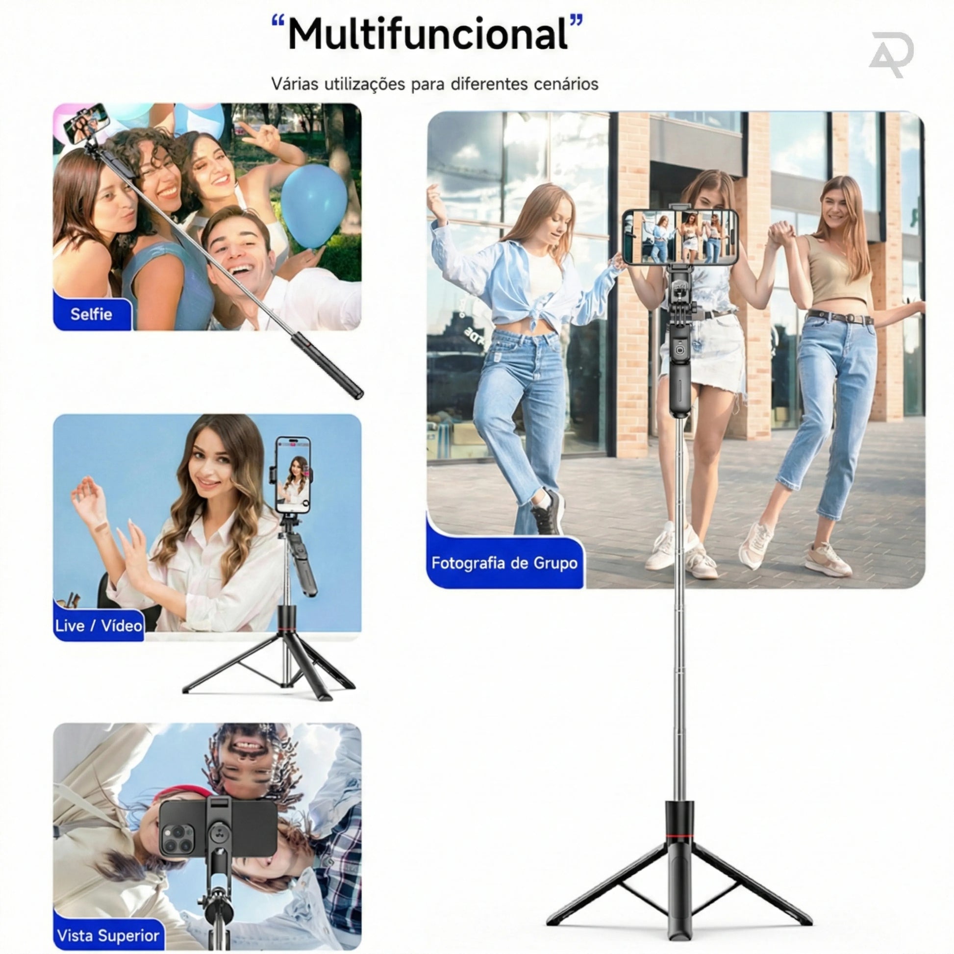 O Tripé Multifuncional 360º com Controlo Remoto foi desenvolvido para quem quer criar fotos e vídeos mais estáveis, profissionais e versáteis, em qualquer situação. Com ajuste total de ângulos, altura extensível até 1,7 m e comando remoto incluído, adapta-se facilmente a selfies, vídeos, lives, chamadas ou fotografias de grupo.