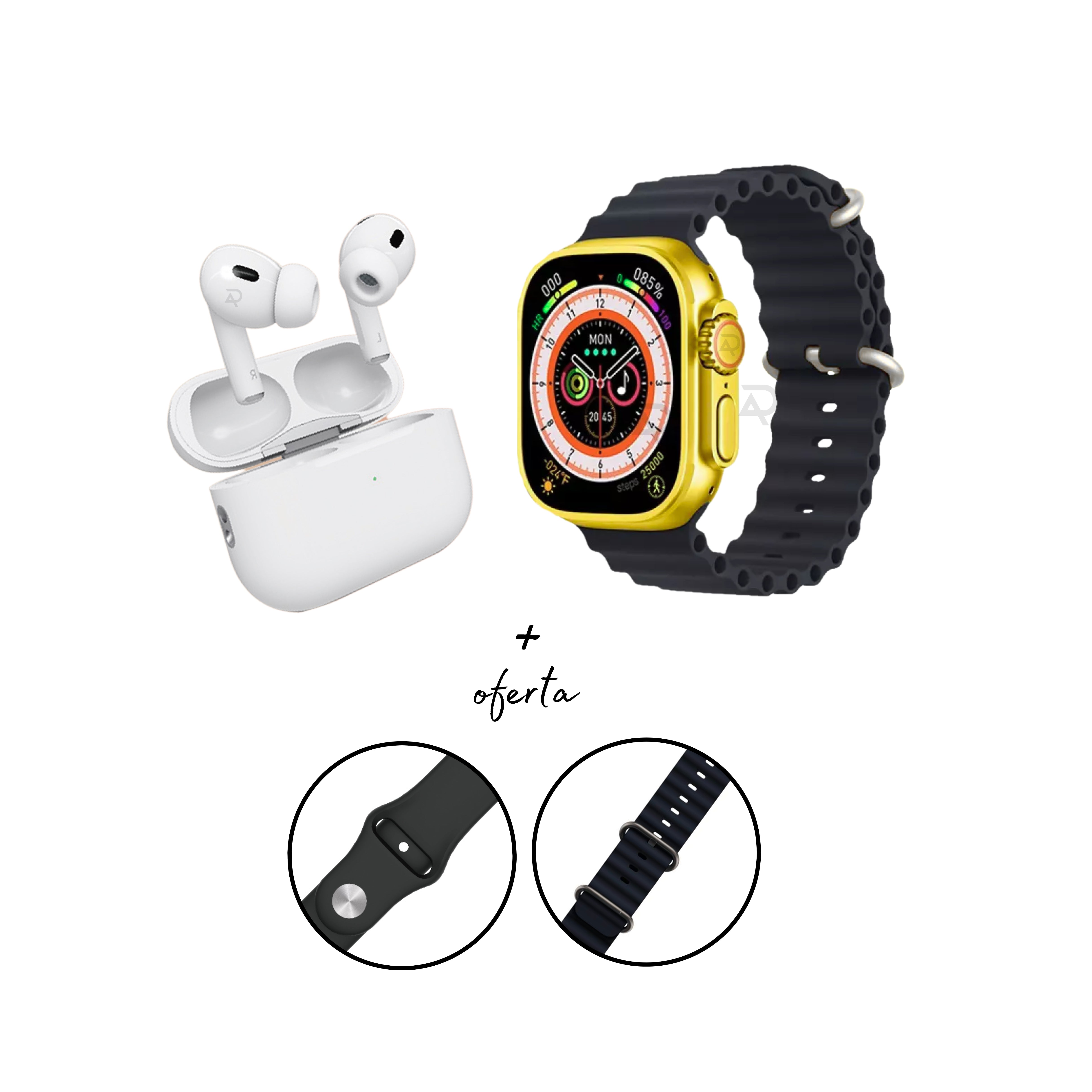 Smartwatch Ultra + Fones: A melhor combinação qualidade/preço. Desfruta de um design moderno aliado a funcionalidades avançadas, perfeitas para o teu dia a dia.